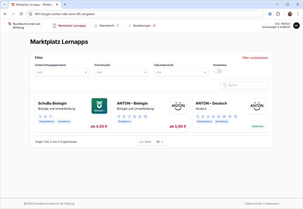 Die im Katalog, im Warenkorb sowie in der Bestellübersicht angezeigten Beträge dienen ausschließlich der transparenten Budgetübersicht. Für Schulen entstehen daraus keine Kosten.