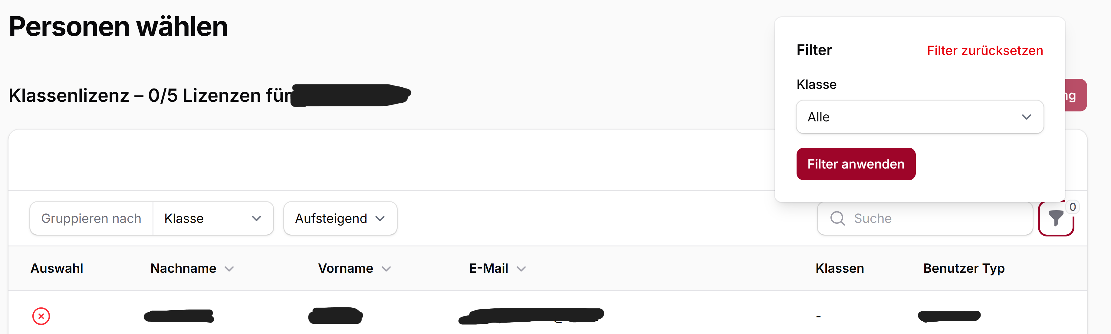 Für die Suche nach einzelnen Schülerinnen und Schülern verwenden Sie das Suchfeld.