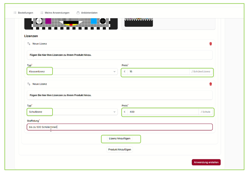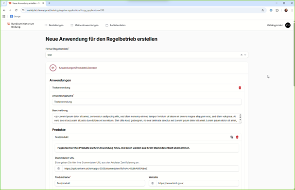 Am Ende können Sie alle Angaben zur Anwendung und den dazugehörigen Produkten und Lizenzen speichern. Diese wird als neue Anwendung angelegt und muss noch geprüft werden, bevor sie im Marktplatz Lernapps für den Regelbetrieb freigeschaltet wird.
