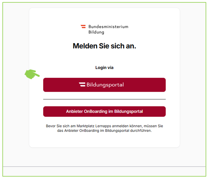 Loggen Sie sich zunächst als Anbieter/in ein. Rufen Sie dazu die Seite marktplatz-lernapps.at auf und wählen Sie die Schaltfläche „Login via Bildungsportal“.
