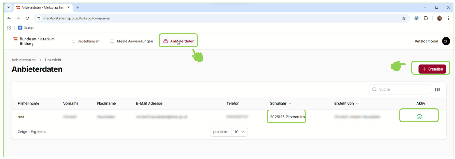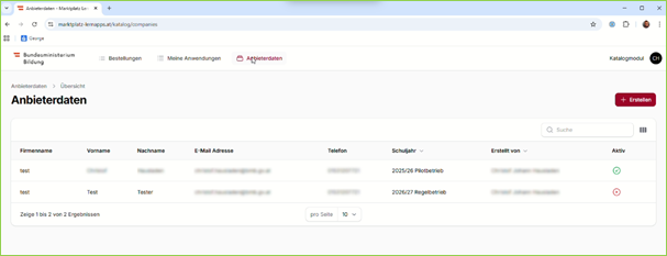 Dort sehen Sie die Daten Ihres Unternehmens. Zusätzlich wird angezeigt, dass diese Daten für den Pilotbetrieb (Sommersemester 2025/26) aktiv sind – erkennbar an den grünen Markierungen auf der rechten Seite.
