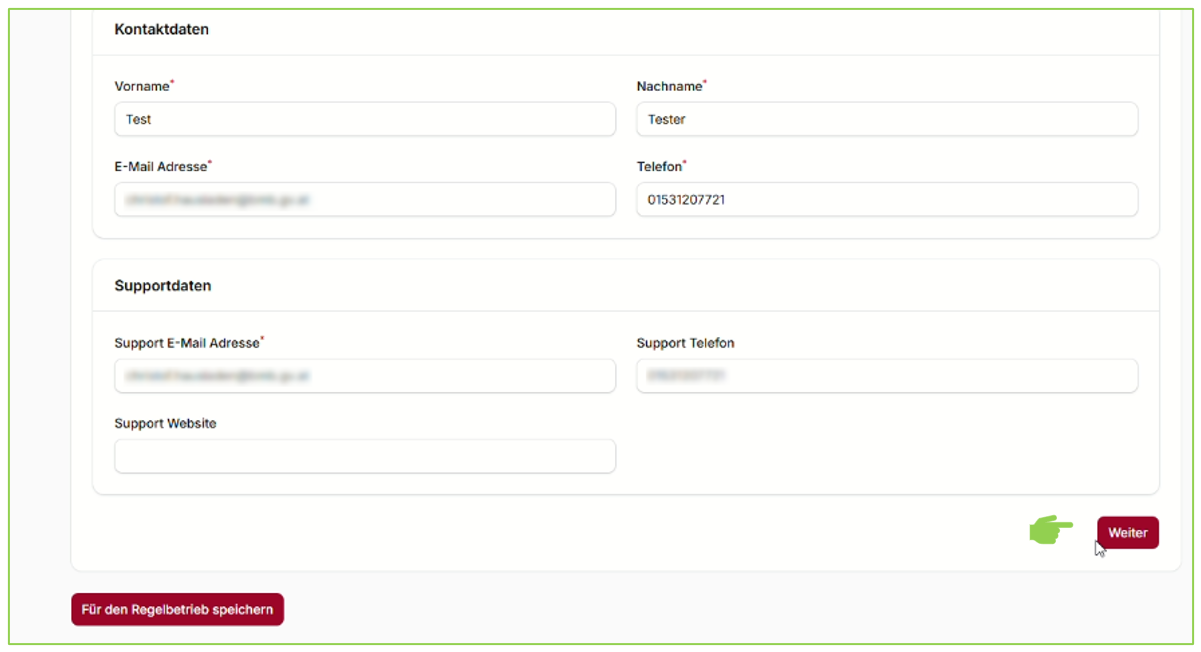 Nachdem Sie Ihre Daten geprüft haben, können Sie bei Bedarf Anpassungen vornehmen. Insbesondere haben Sie die Möglichkeit die Kontaktdaten der Ansprechperson zu ändern, für den Kontakt mit dem OeAD, sowie die Supportdaten zu aktualisieren.
