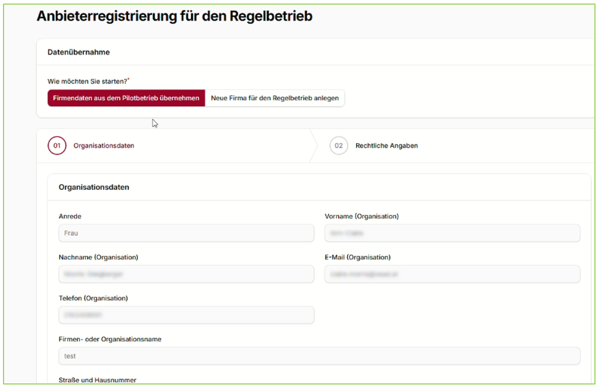 - Sie können die bestehenden Firmendaten aus dem Pilotbetrieb übernehmen (die Angaben bleiben wie in den Stammdaten hinterlegt), oder