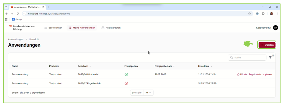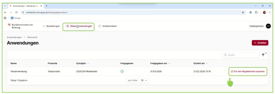 Dort sehen Sie Ihre Anwendungen und Produkte, die bereits im Pilotbetrieb freigegeben wurden. Sie haben die Möglichkeit, bestehende Anwendungen für den Regelbetrieb zu übernehmen bzw. zu kopieren, wenn Sie diese weiterhin anbieten möchten.