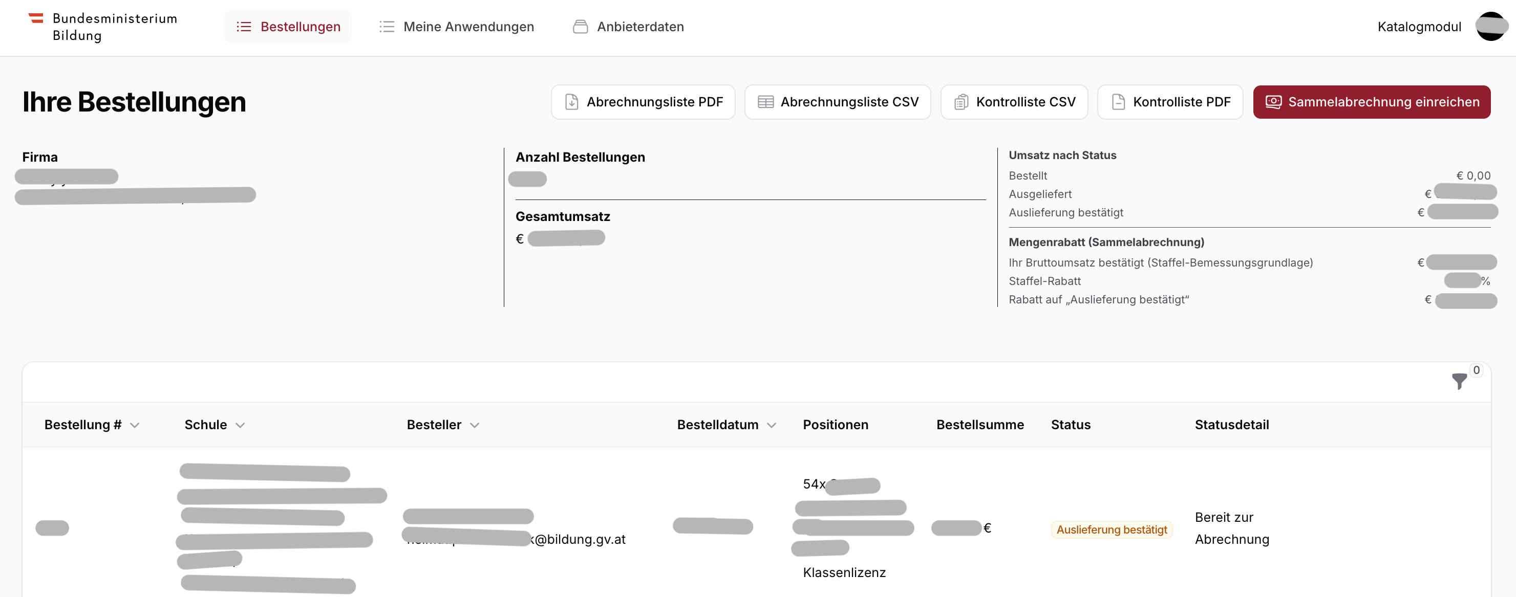 - Verrechnet werden können ausschließlich Bestellungen mit Status "Auslieferung bestätigt", d. h. nur jene Bestellung deren Erhalt von den Schulen am Marktplatz bestätigt wurde.